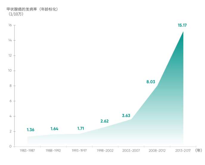另一方面,随着经济水平的改善,多数人特别是年轻人对健康越来越重视,单位或自发的体检里往往就包含有甲状腺的 B 超。做检查的人多了,甲状腺癌的检出也就多了。
